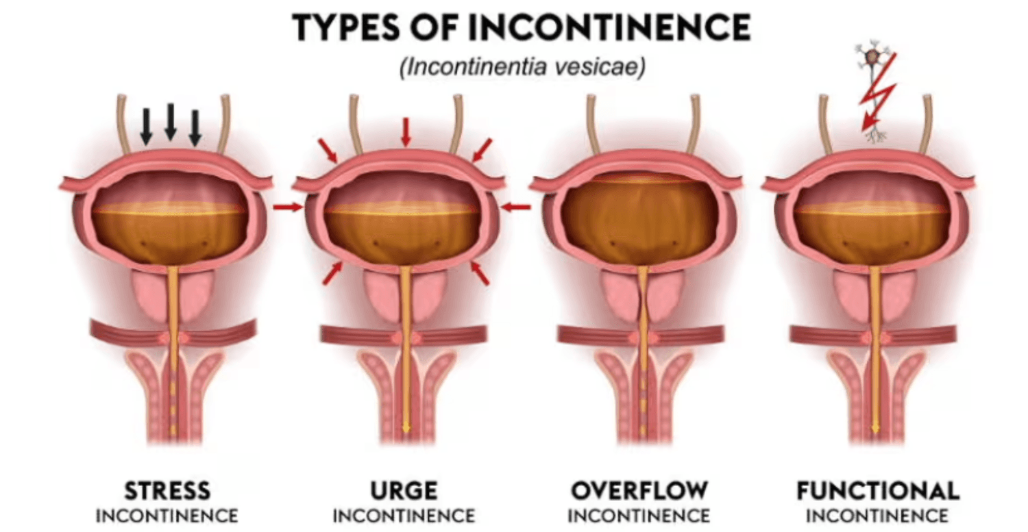- Dranginkontinenz (Urgency): Plötzlicher, kaum kontrollierbarer Harndrang.