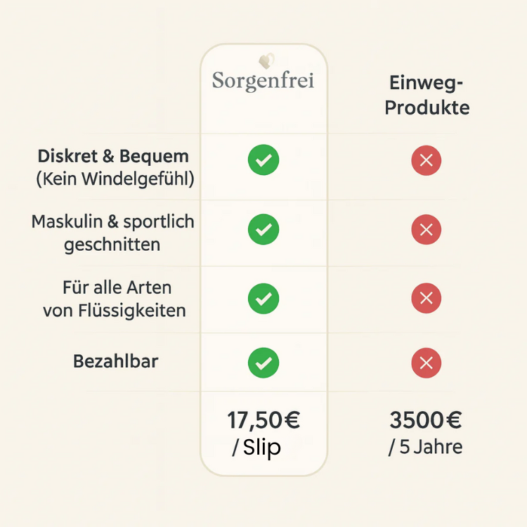 Sorgenfrei ist nicht nur Schutz, sondern echte Sicherheit für Männer im Alltag: sitzt wie normale Slips, bleibt trocken und bequem – ganz ohne „Windelgefühl“.